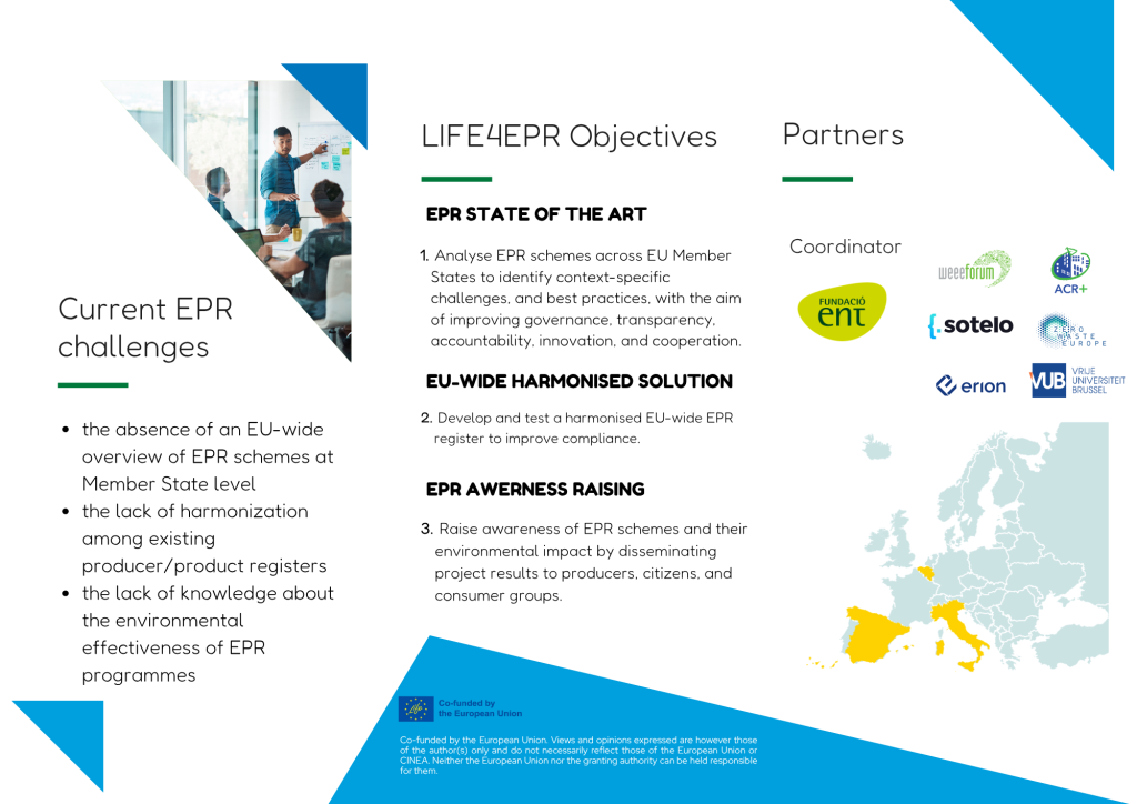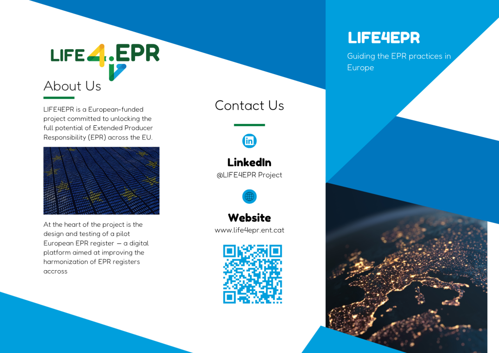 We are excited to announce the release of the first general Life4EPR project brochure. This document provides an overview of the project’s objectives, activities, and expected outcomes. LIFE4EPR aims to strengthen, harmonize, and enhance Extended Producer Responsibility (EPR) systems across the European Union. It focuses on improving the management of electronic waste and promoting a more sustainable circular economy. Download the brochure to discover how Life4EPR is driving positive change for a greener future.